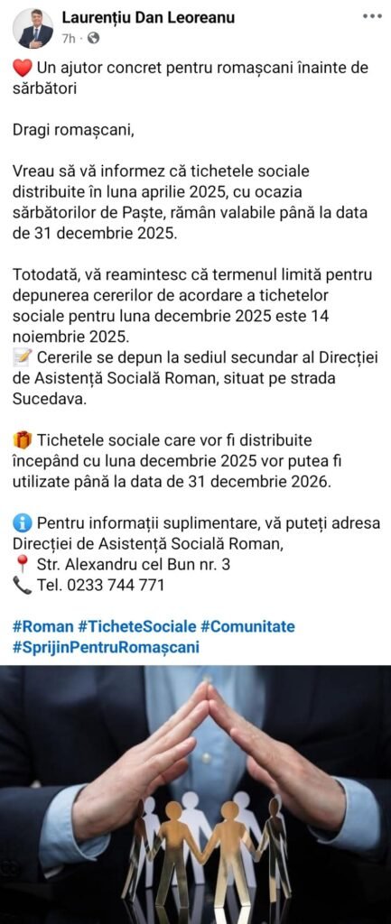 Primarul municipiului Roman. Laurențiu Leoreanu anunță „un ajutor concret pentru romașcani înainte de sărbători”.
