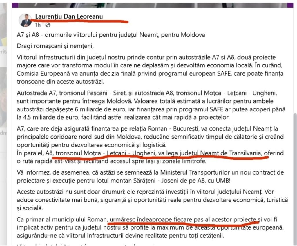În loc să urmărească proiectele reale care chiar ar lega Moldova de vestul țării – cum este segmentul Târgu Neamț – Leghin – Miercurea Nirajului – Lețcani – Leoreanu preferă să „lege Neamțul de Transilvania” prin Iași și Ungheni, probabil pe o autostradă virtuală.