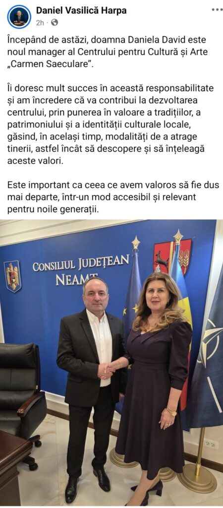 Începând de astăzi, Daniela David este noul manager al Centrului pentru Cultură și Arte „Carmen Saeculare”, instituție emblematică pentru viața culturală a județului Neamț.