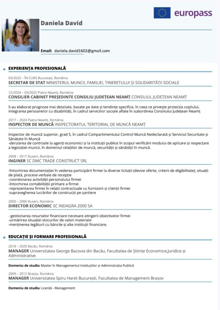 Potricir CV-ului, Daniela David a fost inspector de muncă la ITM Neamț, consilier în cadrul Consiliului Județean Neamț, iar în martie 2025 a cocupat funcția de secretar de stat în Ministerul Muncii.