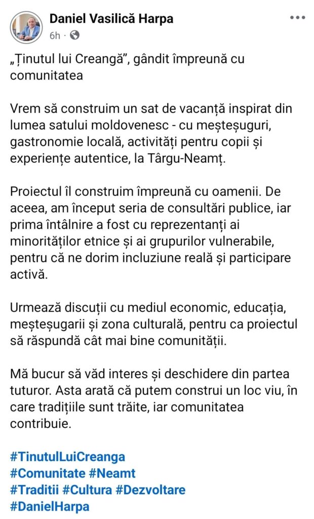 Astăzi, Daniel Harpa vorbește despre același proiect într-o cheie diferită. Președintele CJ Neamț a anunțat că „Ținutul lui Creangă” este gândit împreună cu oamenii, iar primele consultări publice au început deja.