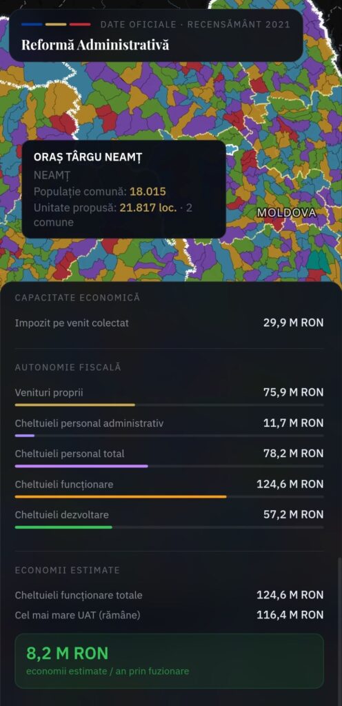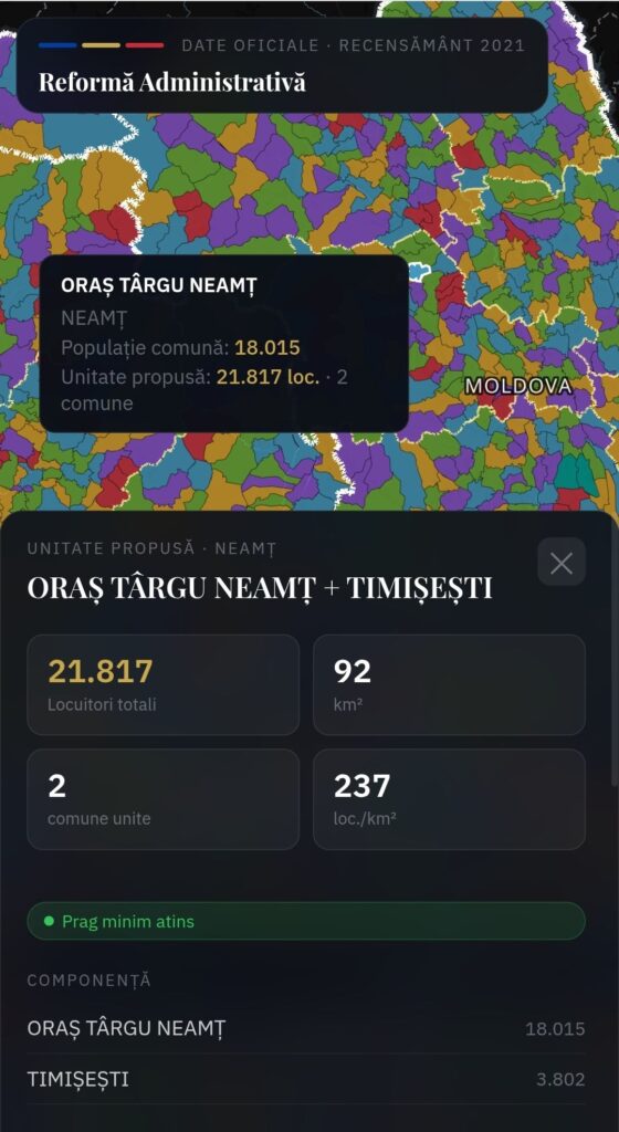 În varianta afișată pe hartă, Târgu Neamț ar urma să fie comasat cu comuna Timișești, rezultând o nouă unitate administrativă cu 21.817 locuitori, o suprafață de 92 de kilometri pătrați și o densitate de 237 locuitori pe kilometru pătrat.