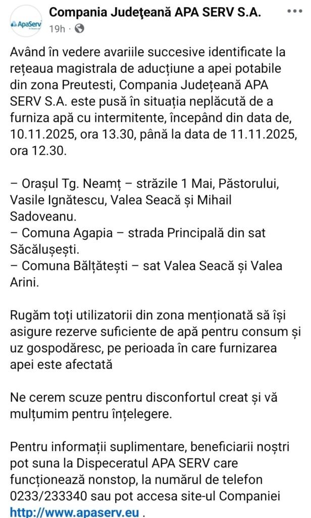 Pe pagina oficială a Companiei Județene APA SERV S.A. Neamț curg anunțurile de întreruperi, avarii și reparații, de parcă rețeaua județeană ar fi o țesătură găurită care se rupe în fiecare zi.